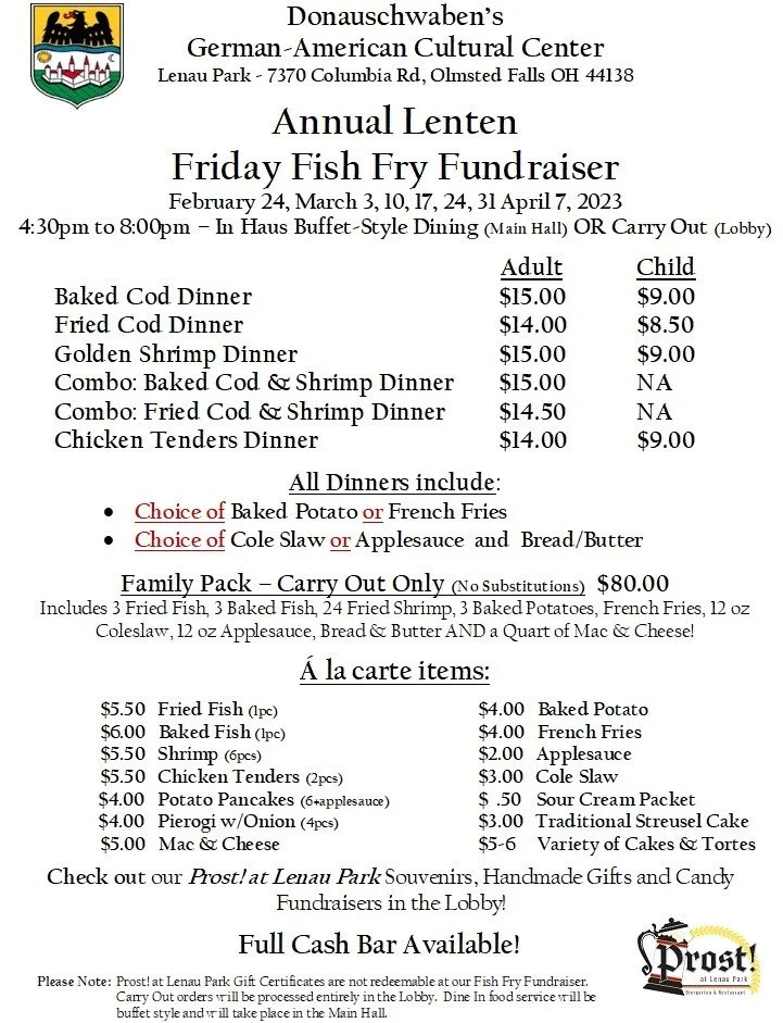 Fish Fry Fundraiser Friday, March 17, 2023 4:30 PM 8:00 PM Donauschwaben’s German-American Cultural Center 7370 Columbia Road Olmsted Twp., OH, 44138 United States (map) Google Calendar ICS