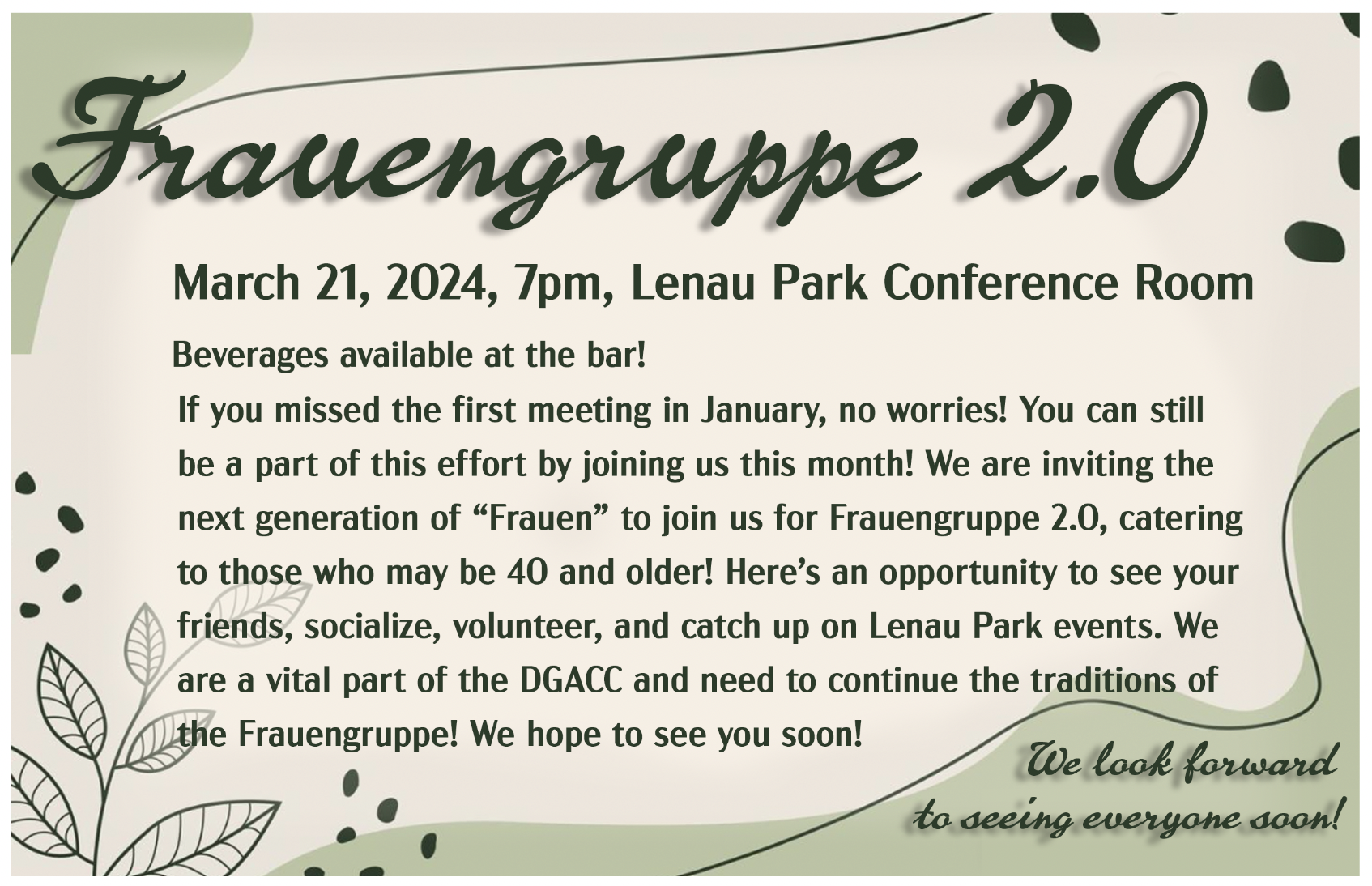 Fraungruppe 2.0 Gathering Thursday, March 21, 2024 7:00 PM 8:00 PM Donauschwaben’s German-American Cultural Center 7370 Columbia Road Olmsted Twp., OH, 44138 United States (map) Google Calendar ICS