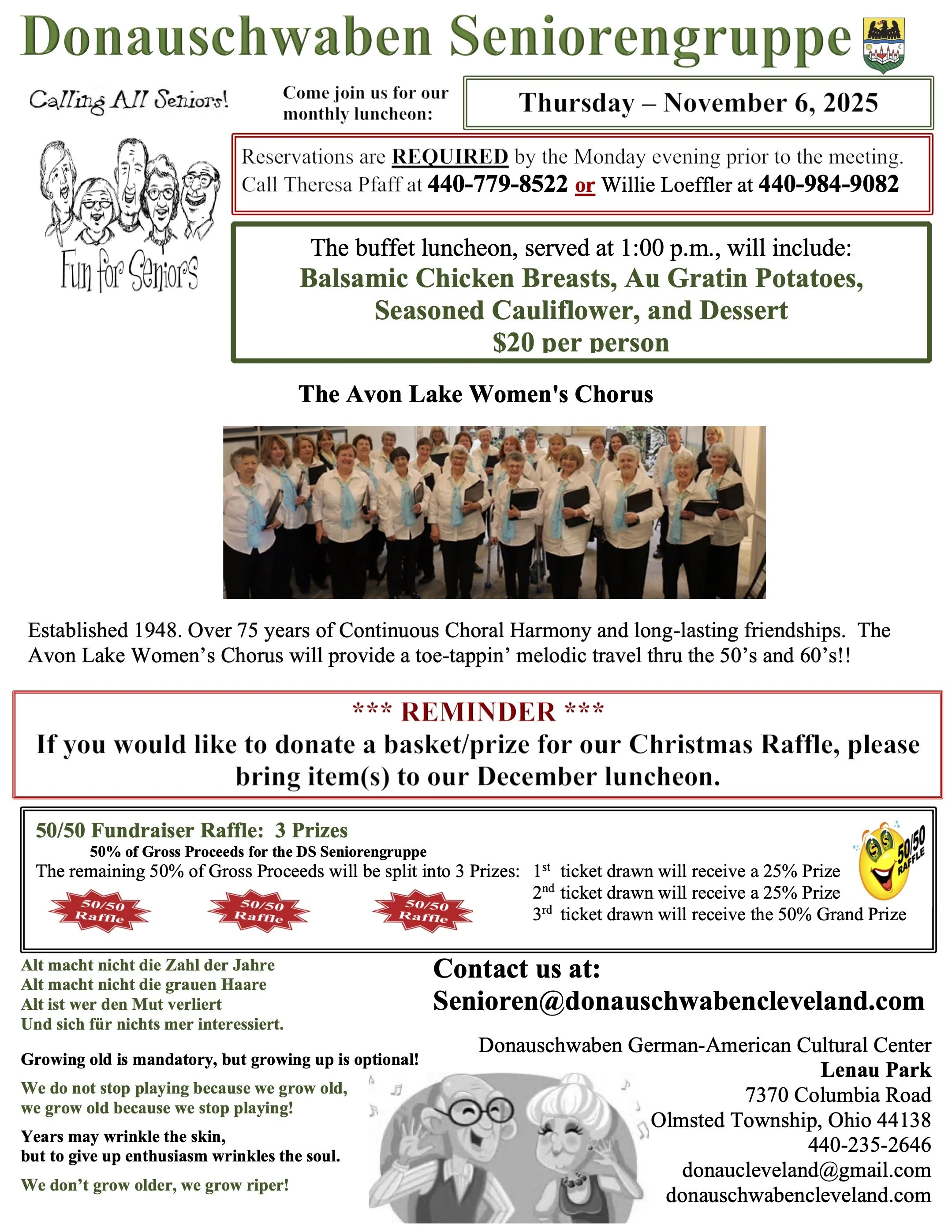 Senioren Meeting Thursday, November 6, 2025 1:00 PM 2:00 PM Donauschwaben’s German-American Cultural Center 7370 Columbia Road Olmsted Twp., OH, 44138 United States (map) Google Calendar ICS